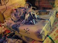 My problem? I don't want to stop. I want to continue wrapping gifts to put under the tree...which, will be up and blinking w/lights come Friday. You may ask, why is this a problem? I promised myself, in my head of course - where I'm the only one who has heard this promise - that I would wait until AFTER Thanksgiving. What until the tree is up. On top of that, I have many chores to do tonight. But 92% of me wants to ditch all of that to deck out my gifts. If there was a job title of Gift Wrapper (all year long, mind you) - I would do it for a low, hourly rate. No joke. Hmmm. I wonder what one would say, if I set up a Wrapping Station at the local mall - with a tip jar - and customers could pay as they wish?